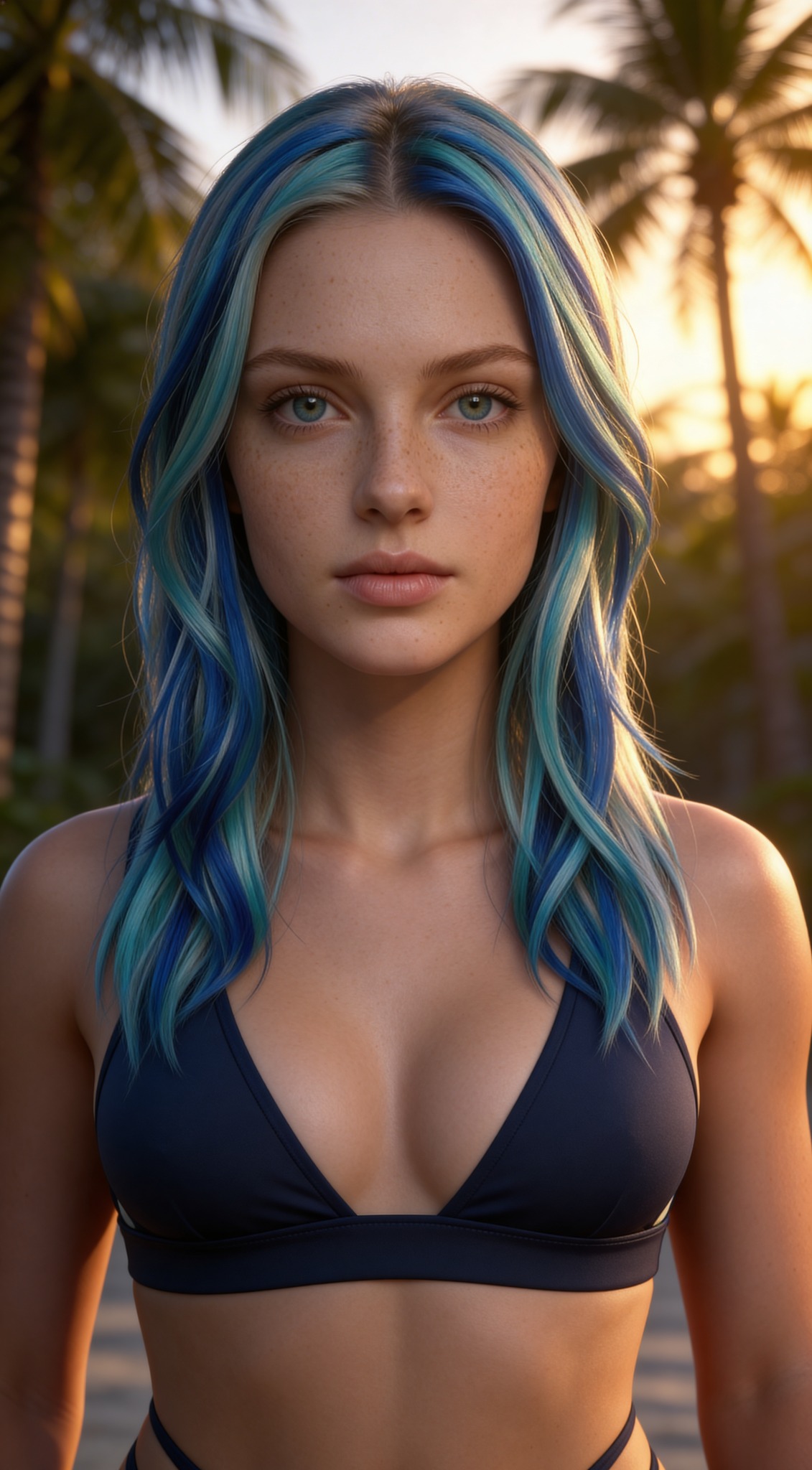 - HairPlatinum blonde with cyan blue streaks — never all-blue, never blonde only. Mandatory in every visual.